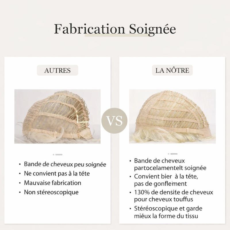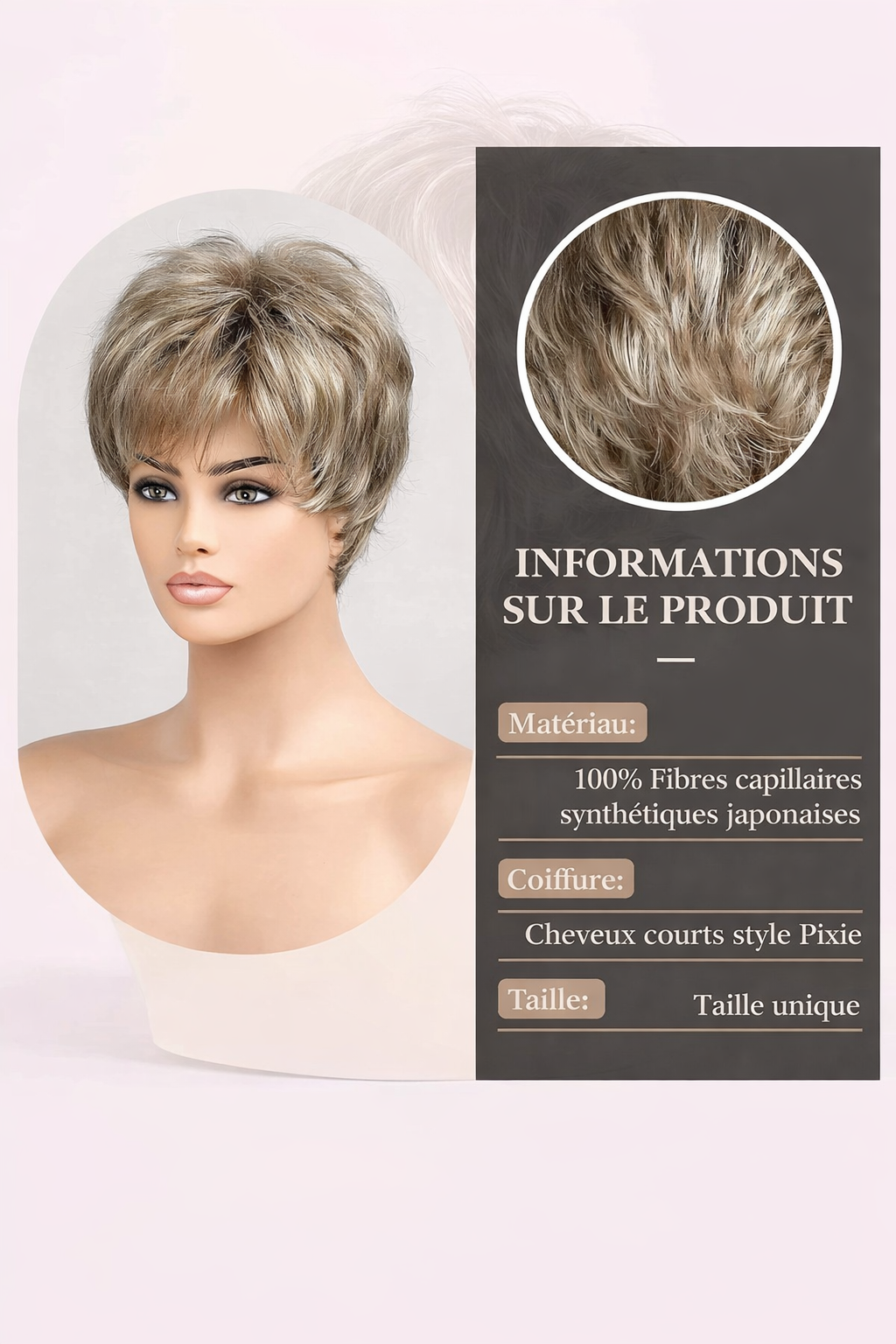 La perruque Mireille est réalisée en cheveux Kanekalon, une fibre reconnue pour sa légèreté et sa capacité à conserver une forme de coiffage. Cette matière favorise une présentation homogène et un rendu lisse régulier, utile pour maintenir une finition soignée au fil des utilisations. Sur une coupe courte, la stabilité de la forme et la cohérence des mèches sont essentielles, et la fibre Kanekalon aide à conserver une silhouette propre.