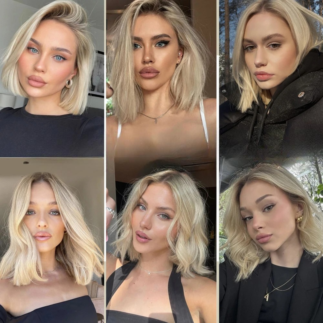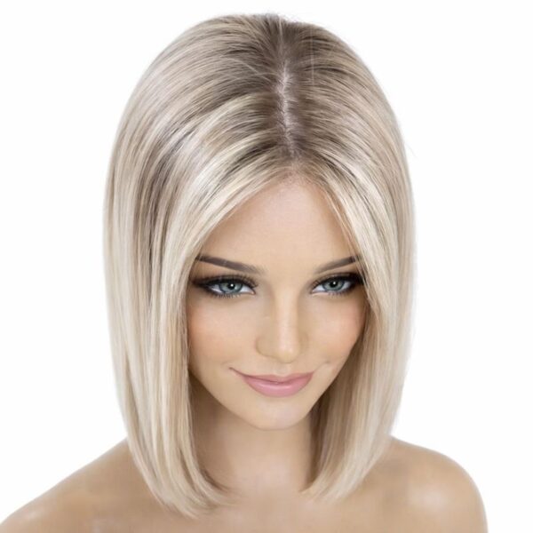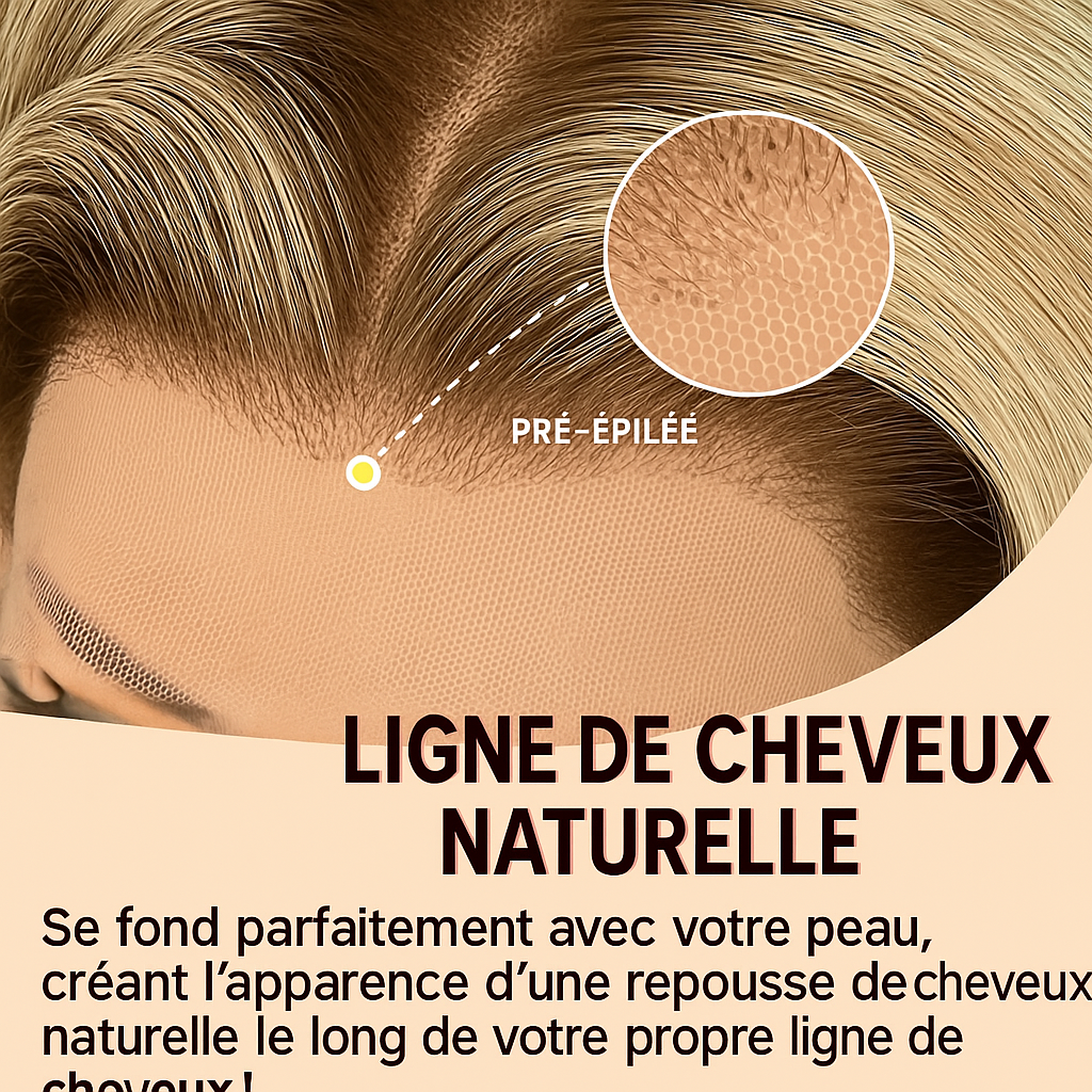 La conception frontale met l’accent sur la ligne du front, un point essentiel pour obtenir une intégration harmonieuse. Une fois la perruque correctement positionnée, la coiffure reste régulière et facile à ajuster, avec une silhouette capillaire propre. Le blond cendré méché met particulièrement en valeur les détails de placement des mèches, ce qui permet de personnaliser le rendu en jouant sur la raie et l’orientation du coiffage.