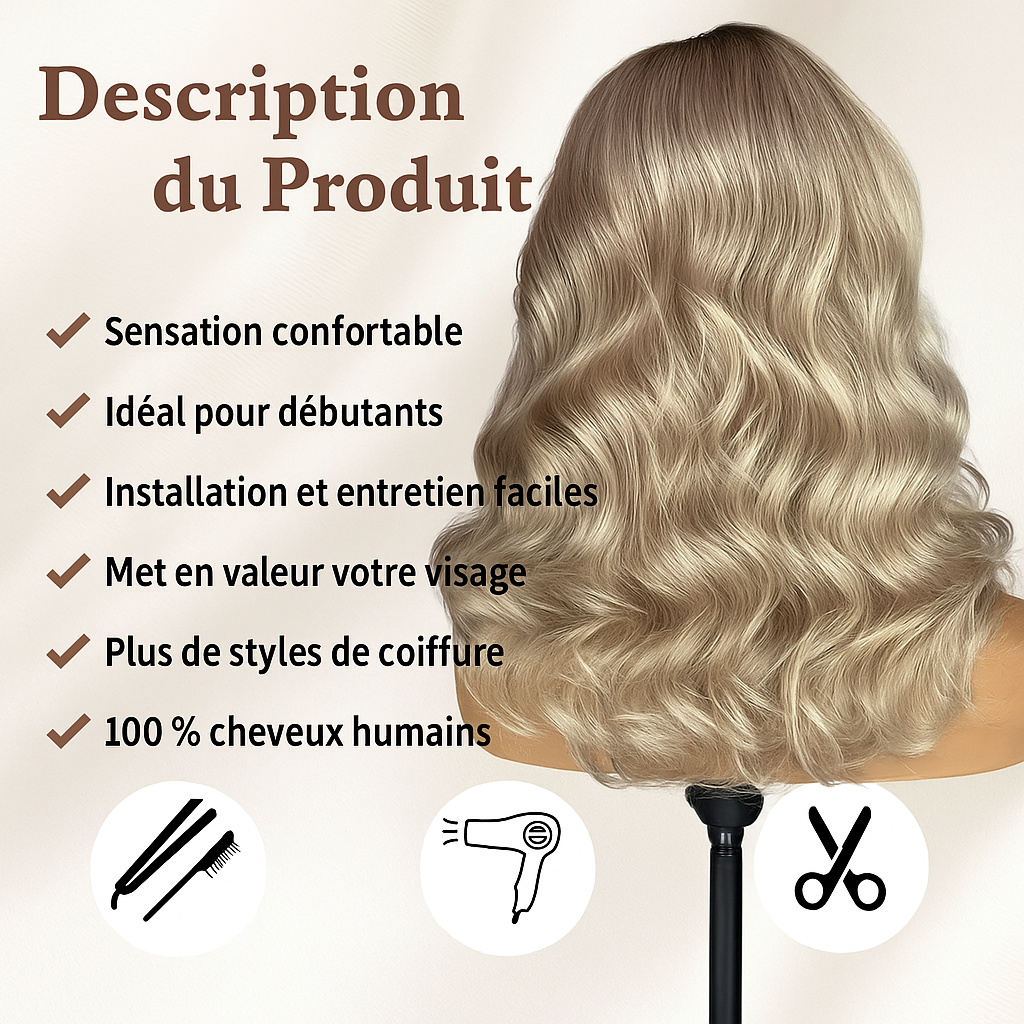 Le matériau de base en dentelle suisse est apprécié pour sa finesse, qui contribue à une finition plus discrète au niveau de la ligne frontale. Cette structure aide à obtenir une intégration visuelle naturelle lorsque la perruque est bien ajustée, particulièrement utile sur une coloration balayage où la zone frontale attire l’attention. La dentelle suisse apporte un rendu plus léger sur le contour, ce qui améliore la qualité de finition et la cohérence globale de la coiffure.